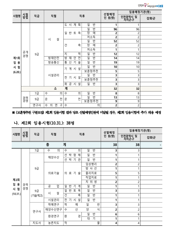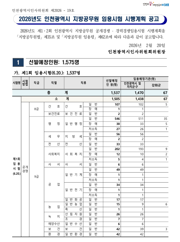[공고] 2026년도 인천광역시 지방공무원 임용시험 시행계획 공고(간호직, 보건진료직, 보건직, 산림자원직, 환경직, 의료기술직, 환경연구사)