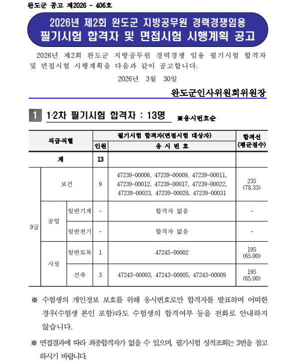 [필합] 2026년 제2회 완도군 지방공무원 경력경쟁 임용시험 필기시험 합격자 및 면접시험 시행계획 공고