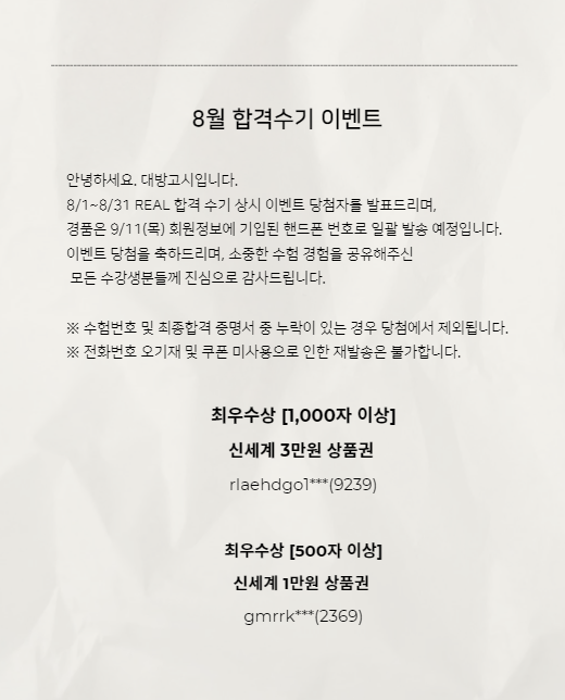 [당첨공지] 25년 8월 REAL 합격 수기 이벤트 당첨자 안내