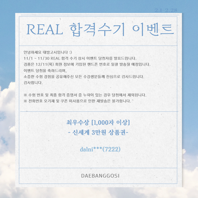 [당첨공지] 25년 11월 REAL 합격 수기 이벤트 당첨자 안내